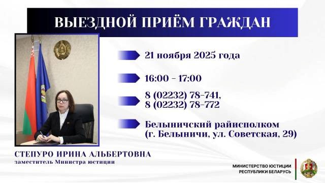 21 ноября 2025 года с 16:00 до 17:00 заместитель Министра юстиции Республики Беларусь Степуро Ирина Альбертовна проведет выездной прием граждан в Белыничском районном исполнительном комитете (г. Белыничи, ул. Советская, 29) по вопросам, относящимся к компетенции Министерства юстиции.