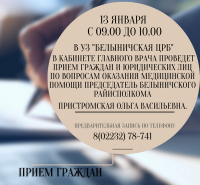 13 января 2023 года с 9-00 до 10-00 часов в учреждении здравоохранения «Белыничская центральная районная больница» в кабинете главного врача проведет прием граждан и юридических лиц по вопросам оказания медицинской помощи председатель Белыничского райисполкома Пристромская Ольга Васильевна.