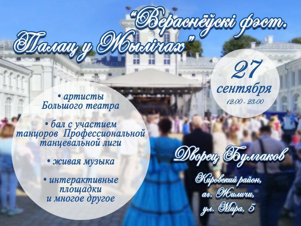 27 сентября 2025 г. в агрогородке Жиличи пройдет региональный праздник «Вераснёўскі фэст. Палац у Жылічах». Для гостей подготовлена насыщенная и яркая программа. Не упустите возможность окунуться в атмосферу XIX века!
