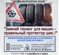 «Зимний тюнинг для машин – правильный протектор шин!» – под таким названием с 25 ноября по 4 декабря проводится республиканская профилактическая акция, цель которой – предупреждение дорожно-транспортных происшествий в зимний период и пропаганда использования зимних шин.