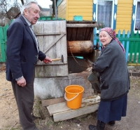 Наступны прыпынак – калодзеж каля хаты пенсіянераў МІХАЙЛАВЫХ. Івану Іванавічу і Марыі Ільінічне ўжо за восем дзясяткаў, але яны не адасабляюцца ад грамадскага жыцця.