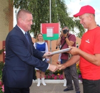 Лучший экипаж зерноуборочного комбайна хозяйства в составе Николая Даречкина и Константина Солодухи намолотил 4030 тонн зерна. С успехом тружеников хозяйства поздравил руководитель области Леонид Заяц.