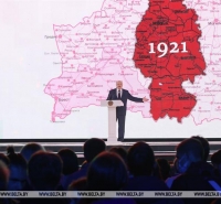 Для большей наглядности по настоянию Президента на форуме была продемонстрирована карта Беларуси 1921 года, когда территория страны была в разы меньше современной. "Посмотрите, где была Беларусь, растерзанная, разорванная, поделенная… Это было справедливо? Нет. 20 лет люди мучились, над ними издевались, запрещали разговаривать так, как они хотят, не говорю уже, что учиться детям негде было, шло ополячивание, полонизация этой части Беларуси. Мы не могли с этим смириться", - акцентировал внимание белорусский лидер.