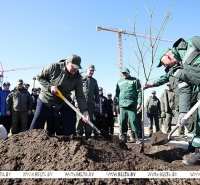Первое дерево на месте парка Народного единства посадил лично Президент. А заодно провел мастер-класс по посадке деревьев. Александр Лукашенко заметил, что люди, которые работают вместе с ним, умеют делать все: сажать деревья, косить траву, рубить дрова.
