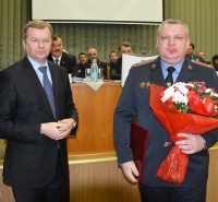 Уладзімір Даманеўскі ўручыў Ганаровую грамату аблвыканкама за добрасумленнае стаўленне да выканання службовых абавязкаў, дасягнутыя поспехі па раскрыцці і прафілактыцы злачынстваў начальніку Бялыніцкага РАУС, падпалкоўніку міліцыі Сяргею КРАСНОВУ.